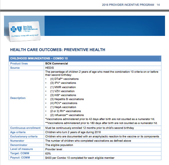 And the bonus comes shortly after age 2, so some doctor’s may have the money incentive to make sure they get all the vaccines called for by the Center for Disease Control (CDC). How do we know this? As reported by Wellness and Quality, this document become available from the internal organs of Blue Cross Blue Shield. And on page 14 of this Provider Incentive Program, you’ll see that the “Payout COMM” is indeed set at $40o.