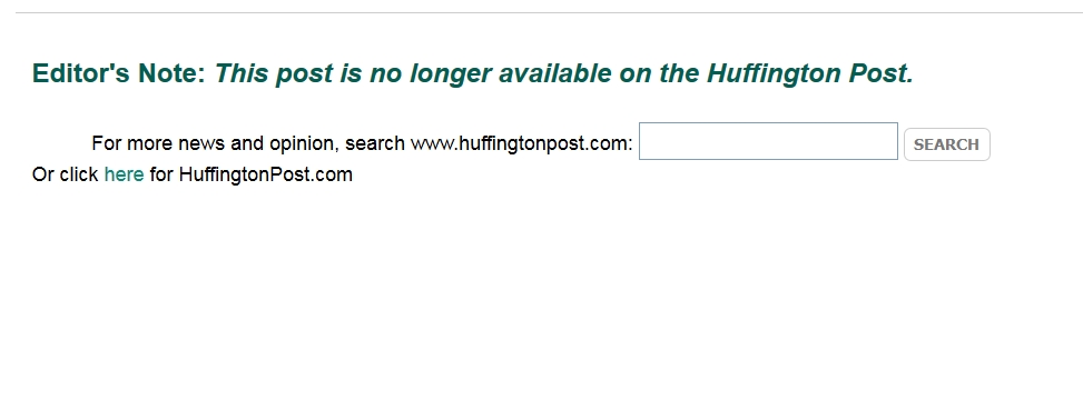 But when we clicked on the link, the following appeared on the HuffPo site, indicating that, obviously, the story had been taken offline: