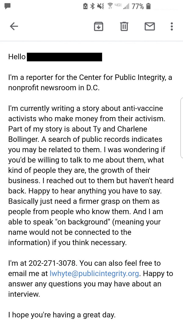 The medical mafia is hard at work among the pharma-influenced left-wing media, and now Natural News has learned that a reporter for The Center for Public Integrity — Liz Essley Whyte — is trolling family members of so-called “anti-vaxxers” to try to dig up dirt to smear them in the liberal media.