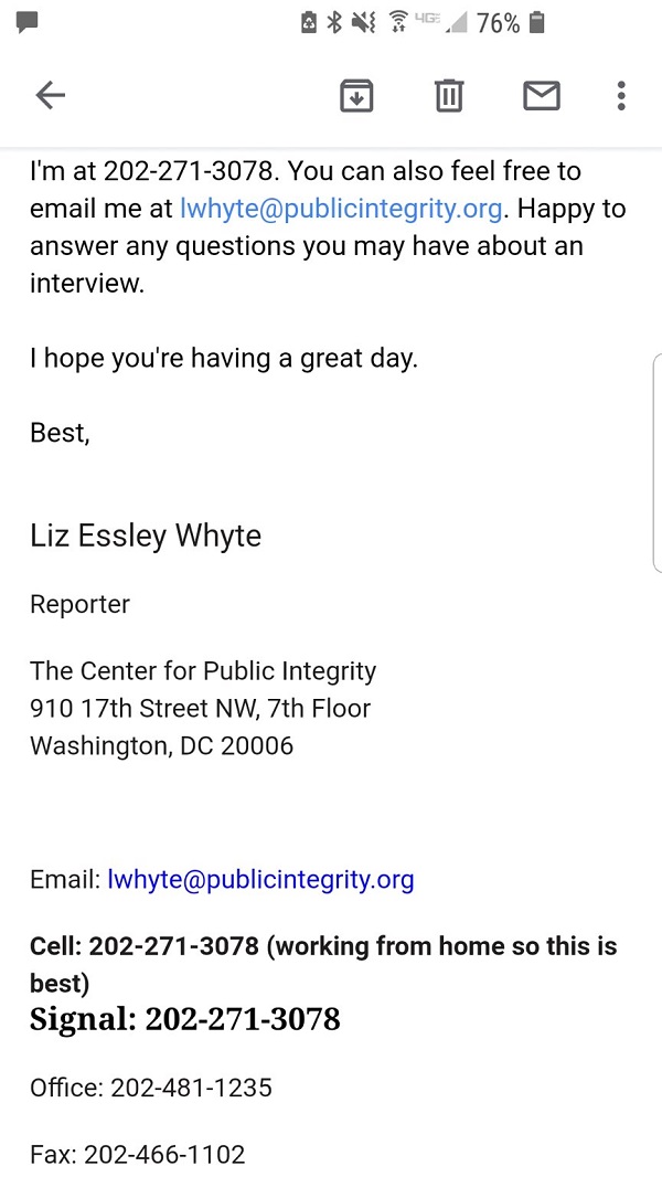 Would Liz Essley Whyte enjoy independent media reporters trolling through public records of her own family members and contacting them to dig up dirt on her? That’s a dirty tactic, but apparently there’s nothing off limits for a center that labels itself “public integrity” while using mafia-style tactics to smear intended targets.